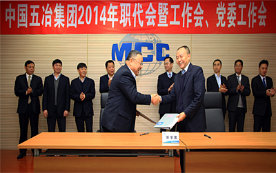 1月18日至19日,中国五冶集团2014年职代会暨工作会在五冶大厦隆重召开。公司领导程并强、蒙昌嘉、 徐永锋、朱永繁、 刘伟、 馬学森、 陈雅、 田 舜、曹翔、万明海、谭兴山、黄德鸽、程先云,职工董事、监事及总经理助理、副三总师、上海有限公司班子成员、四川地区各分子公司班子成员、上海地区分公司党政负责人、集团机关部门负责人、上海有限公司机关部门负责人和集团公司职工代表近200人参加了会议。大会由执行主席徐永锋主持。